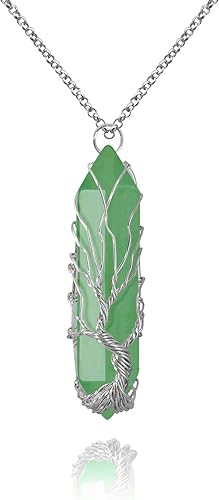 Aventurine-Silver Healing Crystal Necklace Tree of Life Wire Wrapped Natural Stone Point Pendant Necklace