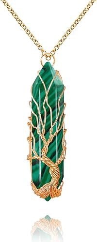 Healing Crystal Necklace Tree of Life Wire Wrapped Natural Stone Point Pendant NecklaceMalachite