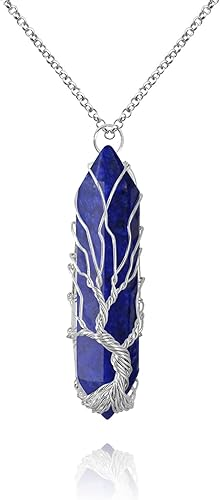 Lapis Lazuli-Silver Healing Crystal Necklace Tree of Life Wire Wrapped Natural Stone Point Pendant Necklace